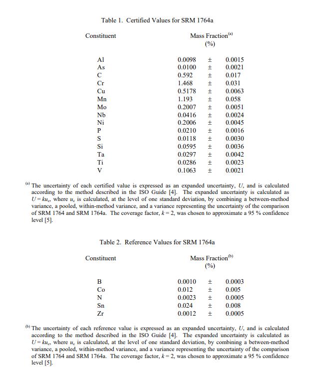 表 1 報告了 SRM 1764a 的 15 種成分的認證值。對于所有元素,值均以質量分數報告 [1]。賦值類別基于 NIST 用于化學成分參考材料的術語和模式的定義 [2]。 NIST 認證值是 NIST 對其準確性有最高置信度的值,因為所有已知或可疑的偏差來源都已被調查或考慮在內。認證值是根據 NIST 和合作實驗室使用儀器和經典測試方法進行的分析結果對真實值的當前最佳估計。參考值:表 2 中報告了五種成分的參考值。參考值是非認證值,是真實值的最佳估計值 [2]。但是,這些值不符合 NIST認證標準,并提供相關的不確定性,可能不包括所有不確定性來源。