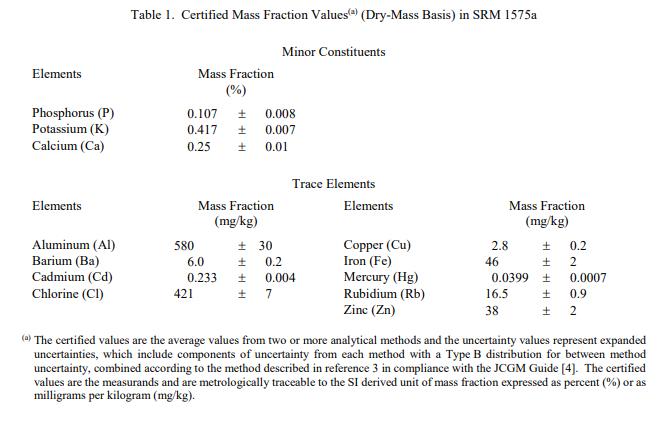 表 2 中提供了十一種成分的參考值,以基于干質量的質量分數(shù)表示。參考值基于從單一 NIST 分析方法獲得的結果。參考值是未經(jīng)認證的值,是對真實值的估計。但是,這些值不符合 NIST 認證標準,并且提供了相關的不確定性,可能不包括所有不確定性來源 [2]。信息值:表 3 中提供了兩個元素的信息值。信息值是一個值SRM 用戶可能感興趣,但沒有足夠的信息來評估與值相關的不確定性 [2]。信息值不能用于建立計量溯源性。